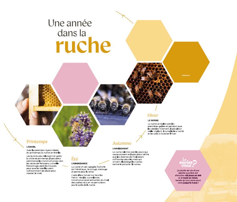 . Retracer l’histoire de la famille et son attachement à la terre. A l’aide d’outils datant de la création de la nougaterie, des schémas sur le cycle de vie dans les prés pour les amandiers, dans la ruche pour le miel.